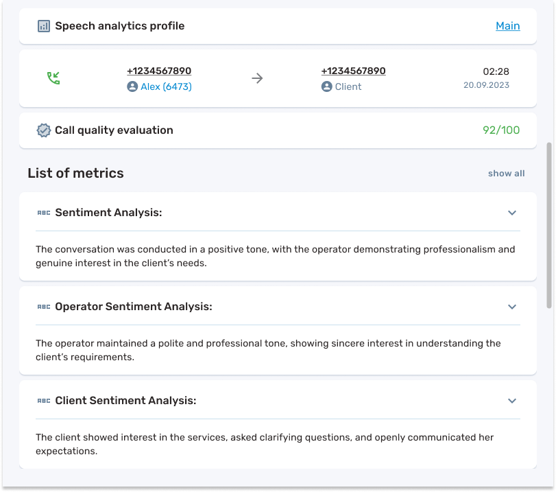 Speech Analytics solves this problem by automatically processing all necessary calls (e.g., only incoming, or only long ones), transcribing them into text, and analyzing them according to set parameters. This allows for 100% coverage of important calls without needing additional staff.