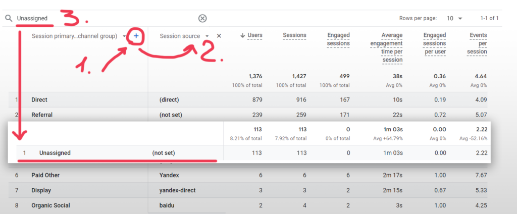 2. Тепер визначаємо Unassigned трафік. Для цього у таблиці слід натиснути на іконку з плюсом, додати вимір Session source/medium, в пошуку ввести “Unassigned” та натиснути enter. Побачите таку таку таблицю: