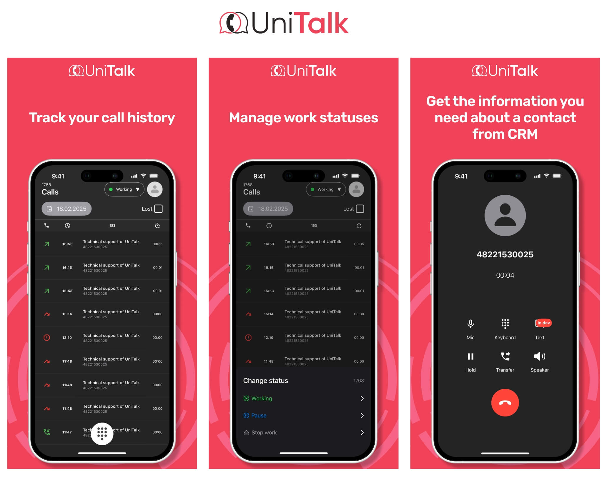 UniTalk Example: We developed the UniTalk app for businesses. It allows executives and managers to manage telephony, listen to call recordings, and view statistics directly from their smartphones. This provides the freedom to work from anywhere in the world.