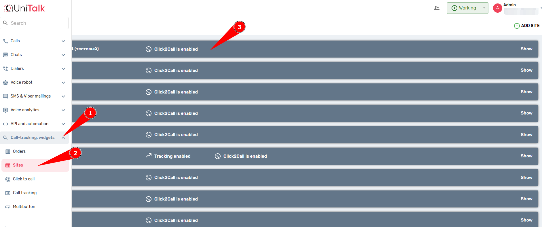 1. Go to the “Sites” section of the UniTalk account and click “Add site”.