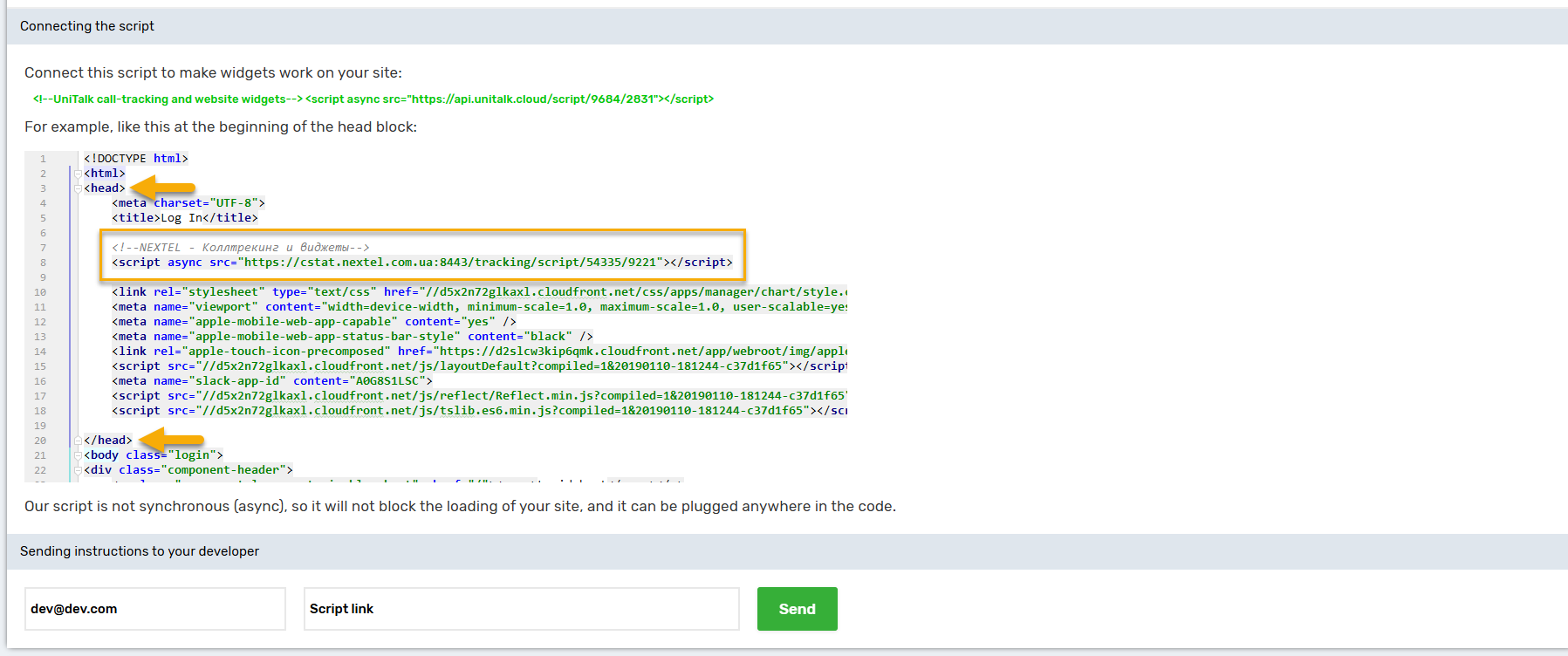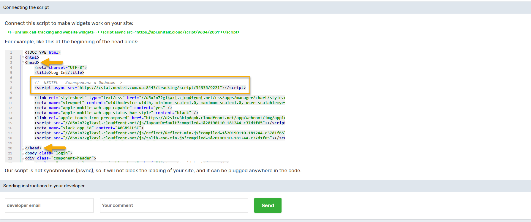 To do this, specify the email of the site developer, you can write a comment, for example, “Anton, please install this script on the site http://companysite.com/” or something similar, if necessary.