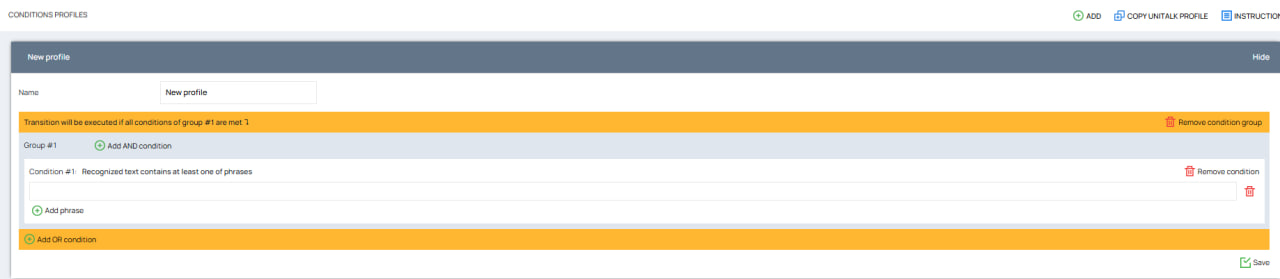 The key advantage of condition profiles is the ability to create them once and then use them in multiple nodes of all voice robots in the project.