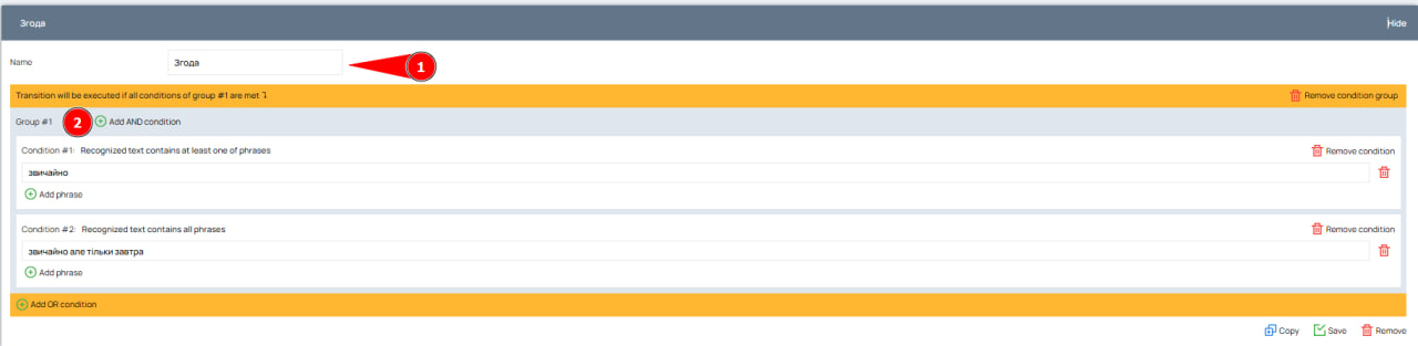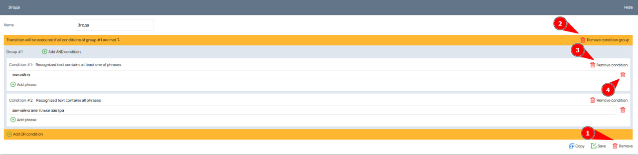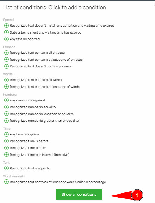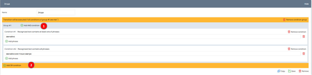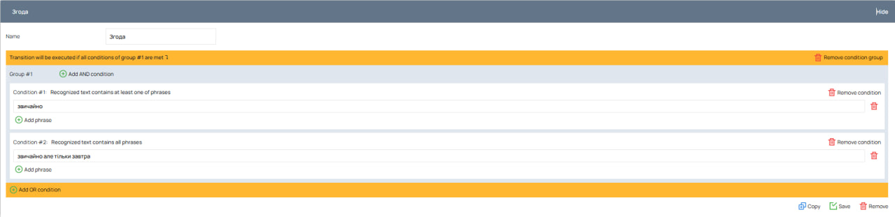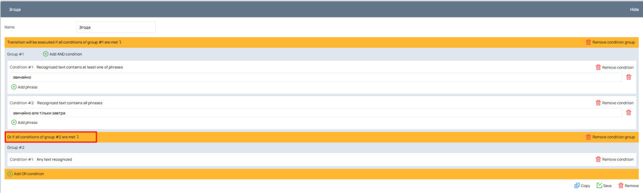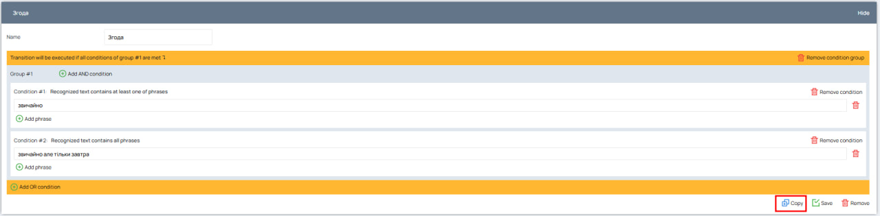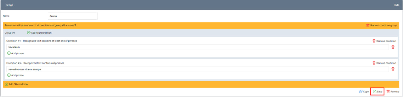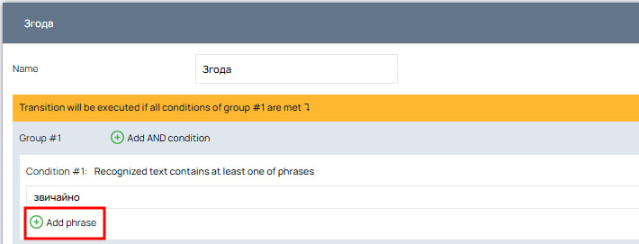 Add condition AND – in this case, the condition will be included in an existing group and will be executed together with the previous conditions, and the transition in the voice robot will be made only if all conditions are met simultaneously.