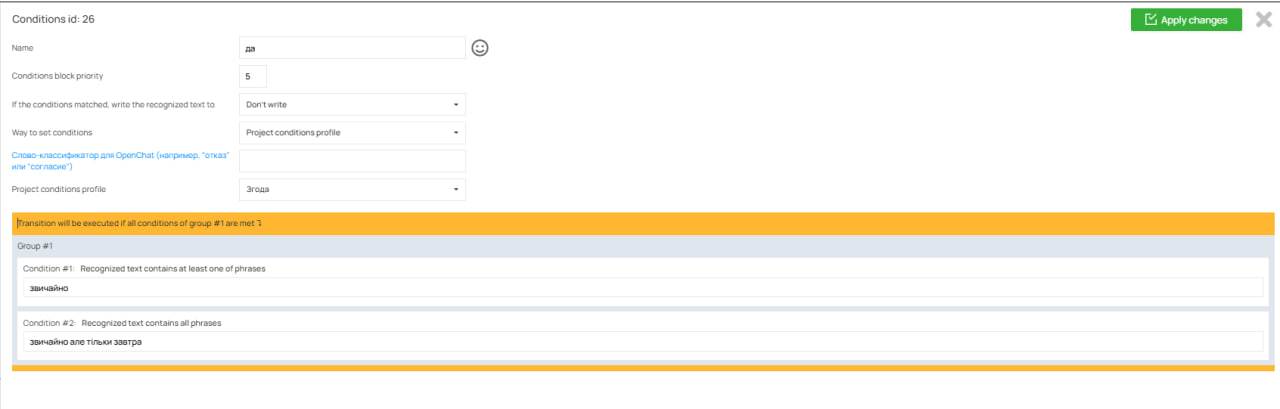 After that, this profile of conditions will be saved in your project and will be available for further editing. You can also supplement it with other phrases or delete/add conditions. How to do this will be discussed further in the article.