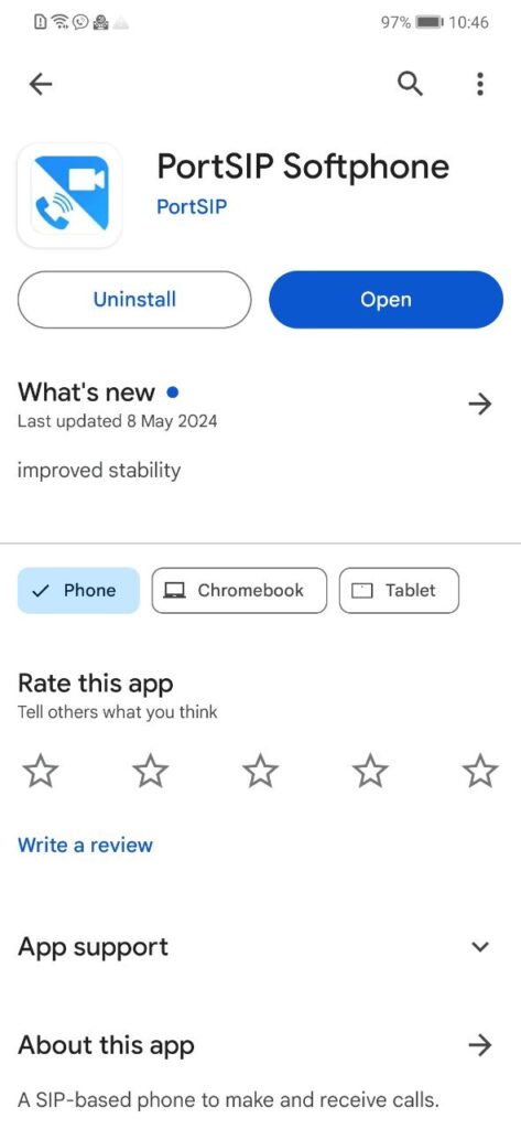 1. In the GooglePlay app store, find and install the app PortSIP.