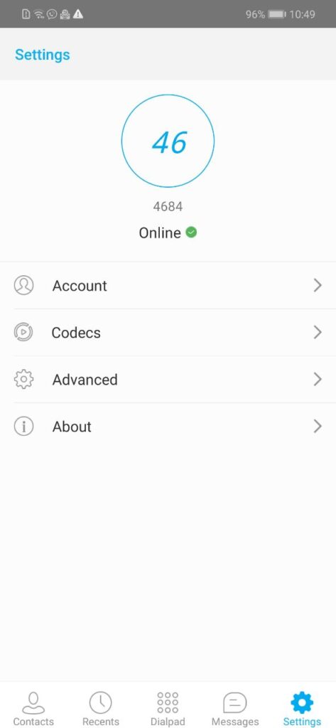 If everything is entered correctly, you will see the status “Online” in the “Settings” menu. This confirms that the PortSIP application is successfully integrated with your UniTalk account and is ready to process calls. You can now receive and make calls over the internet, maintaining high connection quality and control over your business communications without being tied to a stationary workstation.