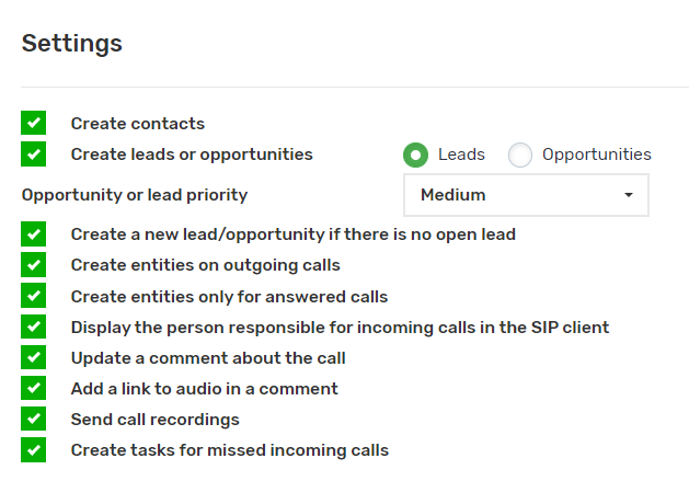 - If you enable the “Create entities on outgoing calls” checkbox, leads and contacts will be created in the CRM system when making outgoing calls to cell phone numbers.