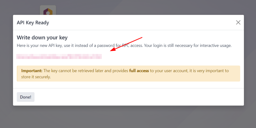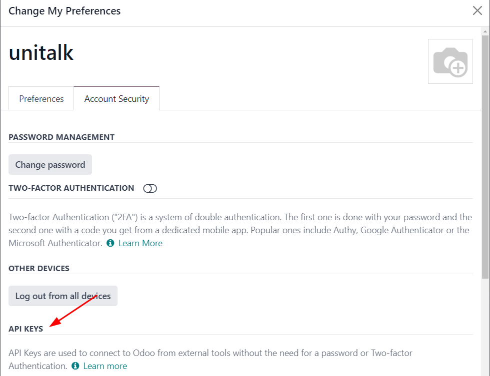 API key should be created in Odoo personal cabinet on the database page in the personal settings in the “Account Security” tab.