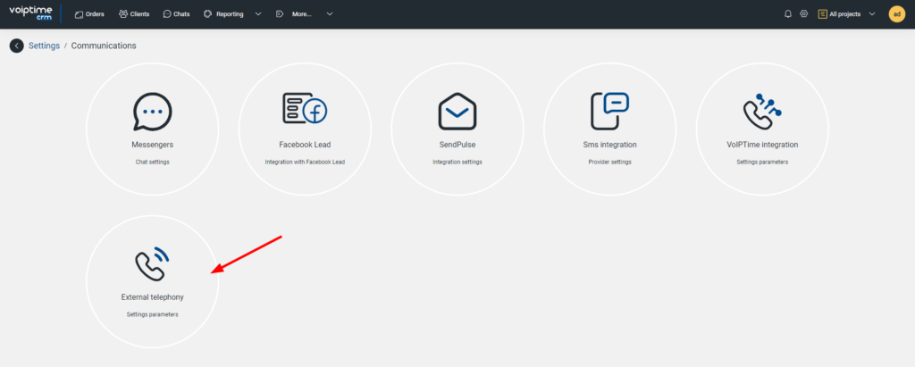 7. Next, set up integration from the CRM system. To do this, you need to configure integration with an external telephony service. In your VoIPTime CRM personal account, go to the “Integrations” section in the settings.