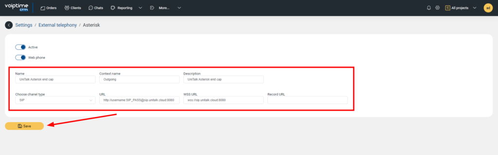Connecting and configuring UniTalk IP telephony integration with VoIPTime CRM