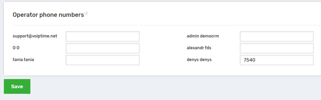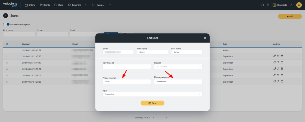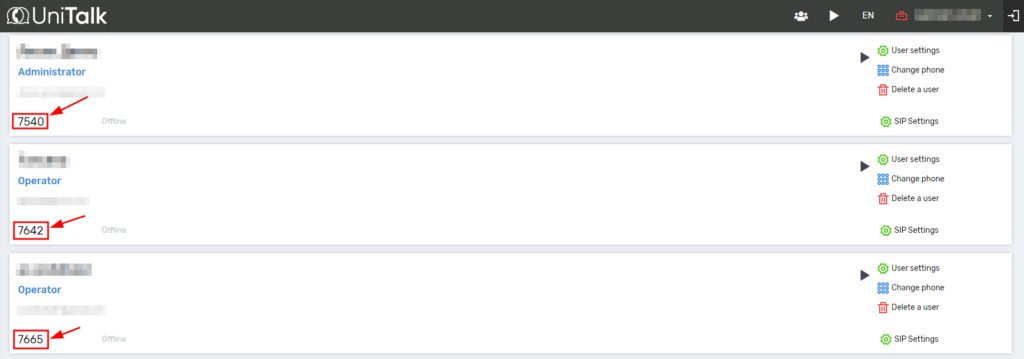5. The next step is to assign SIP line numbers to CRM system users. These numbers can be found in the “Users” section of the UniTalk personal account.
