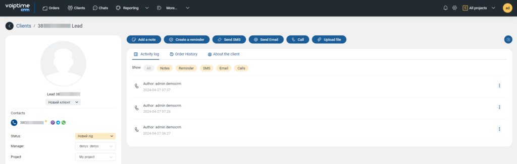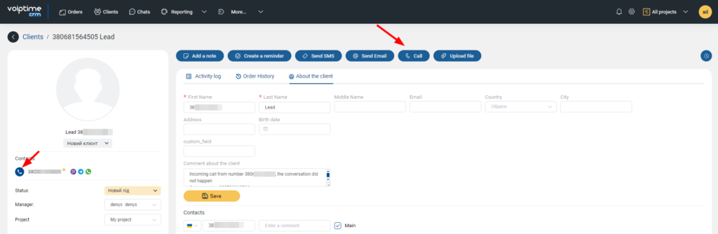 - Create orders – when making calls in the CRM system, orders will be automatically created. For them, you need to specify the status, offer, and project.