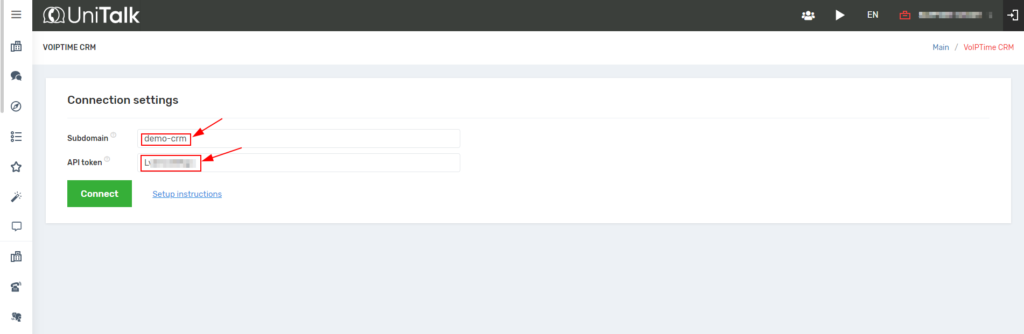 To set up the integration, log in to your UniTalk and VoIPTime CRM personal accounts as an administrator and follow the steps below.