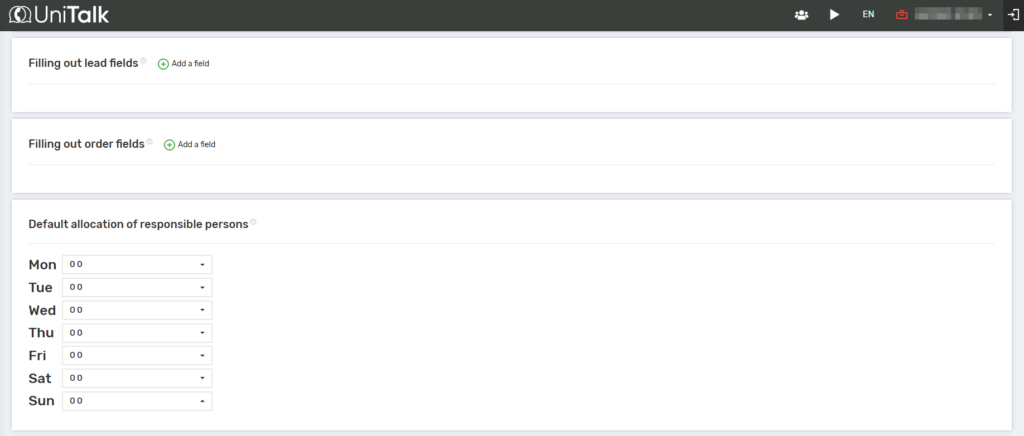You can also fill in the fields of leads and orders, and set up people responsible for missed incoming calls. You can do this by assigning a responsible person to each day of the week.