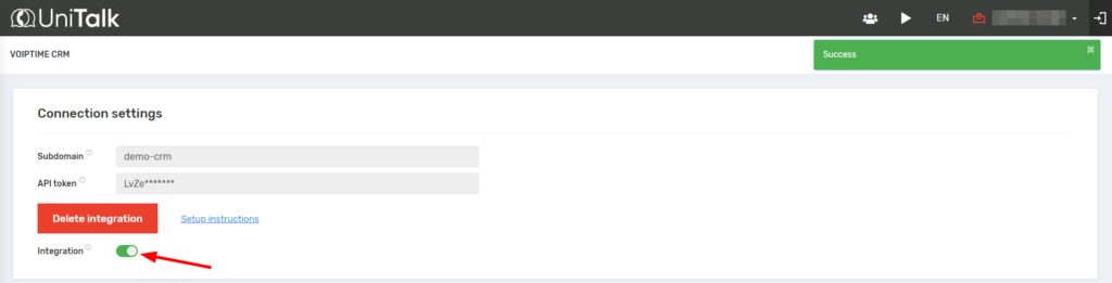 - In your UniTalk personal account, go to the Integration section and select VoIPTime CRM.
