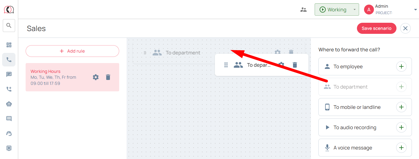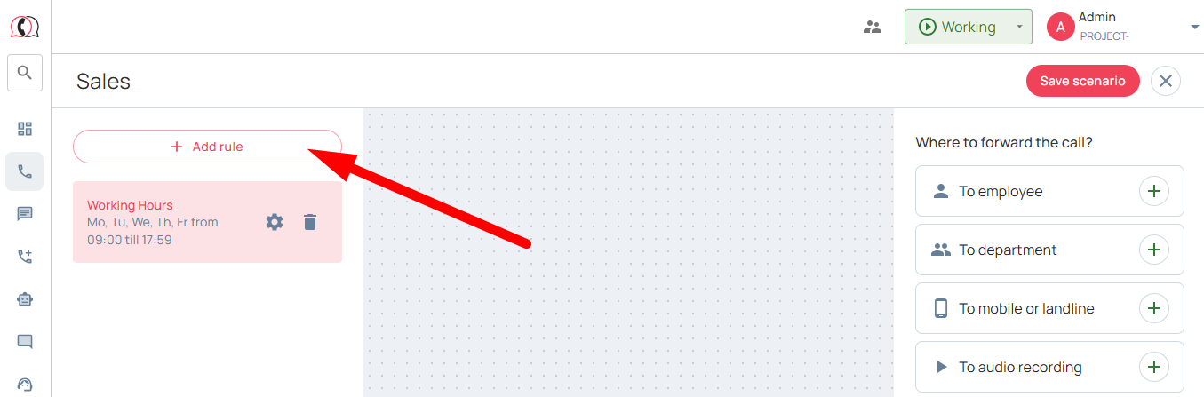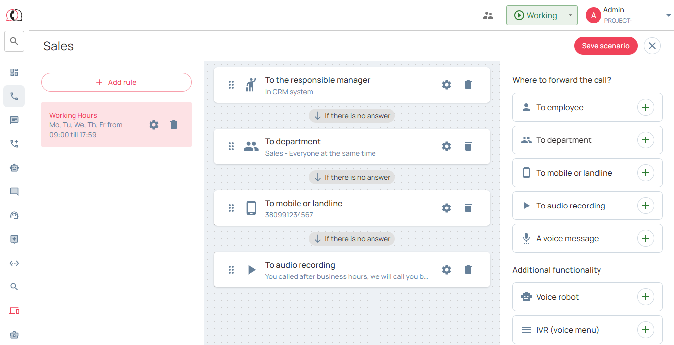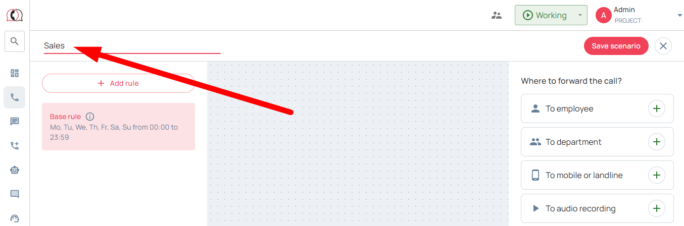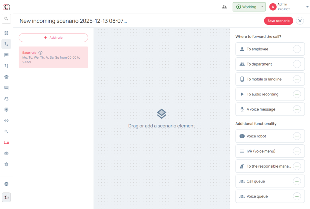 2. Go to the section «Calls» → «Settings» → «Incoming scenarios» → click «Add scenario» and start setting up: