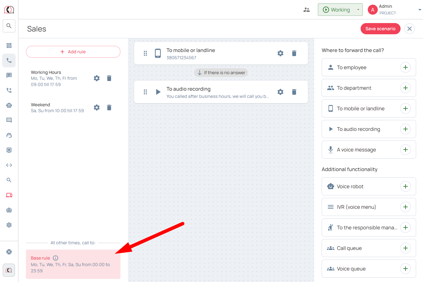 7. Next, set up the “Basic Rule” to make sure that all incoming calls that will be received at all other times (for example, so as not to create separate rules for the period Fri from 18:01 to 29:59; holidays, etc.), when working and non-working time scripts are not involved, get into telephony, for example like this: