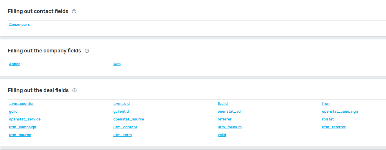 2. Filling in the fields of contacts, deals, leads