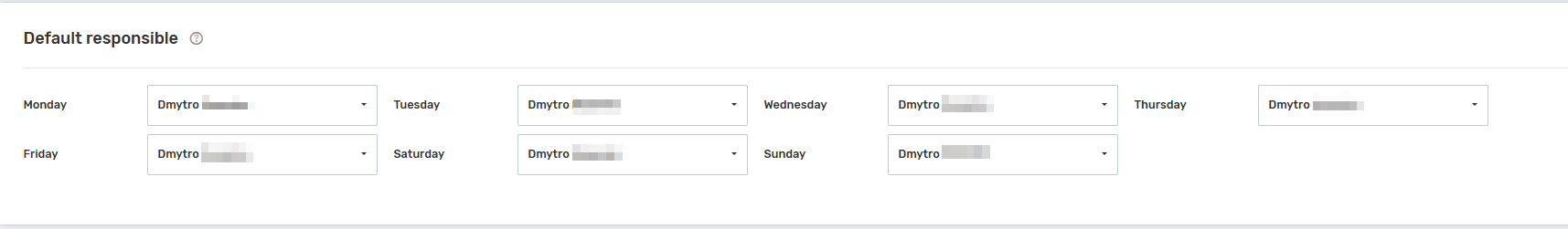 Similar to the settings for calls, you can assign an agent to each day of the week. If for some reason the responsible person cannot be identified automatically, the created entity (contact, deal, or lead) will be assigned to the agent specified in this field.