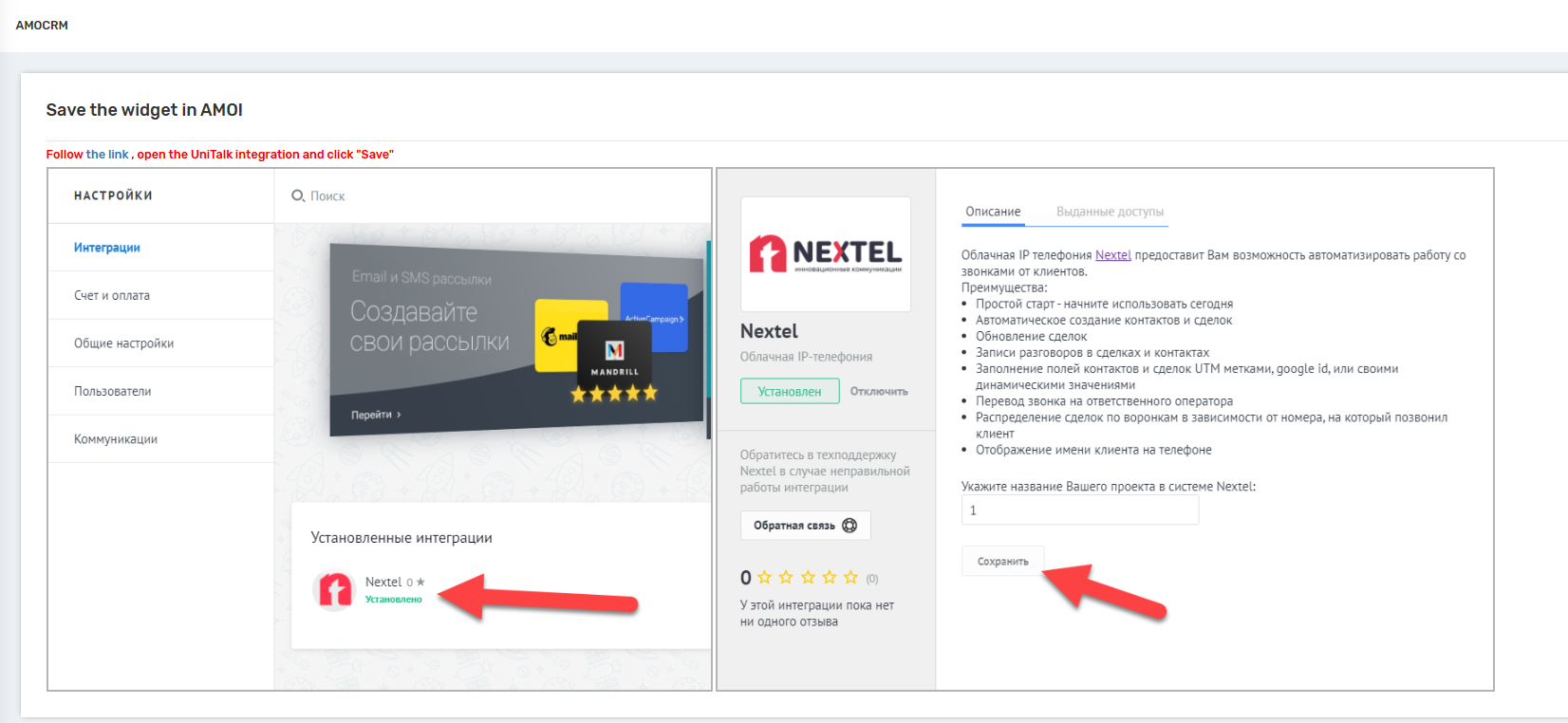 Installing the UniTalk application from the AMO/KOMMO marketplace
