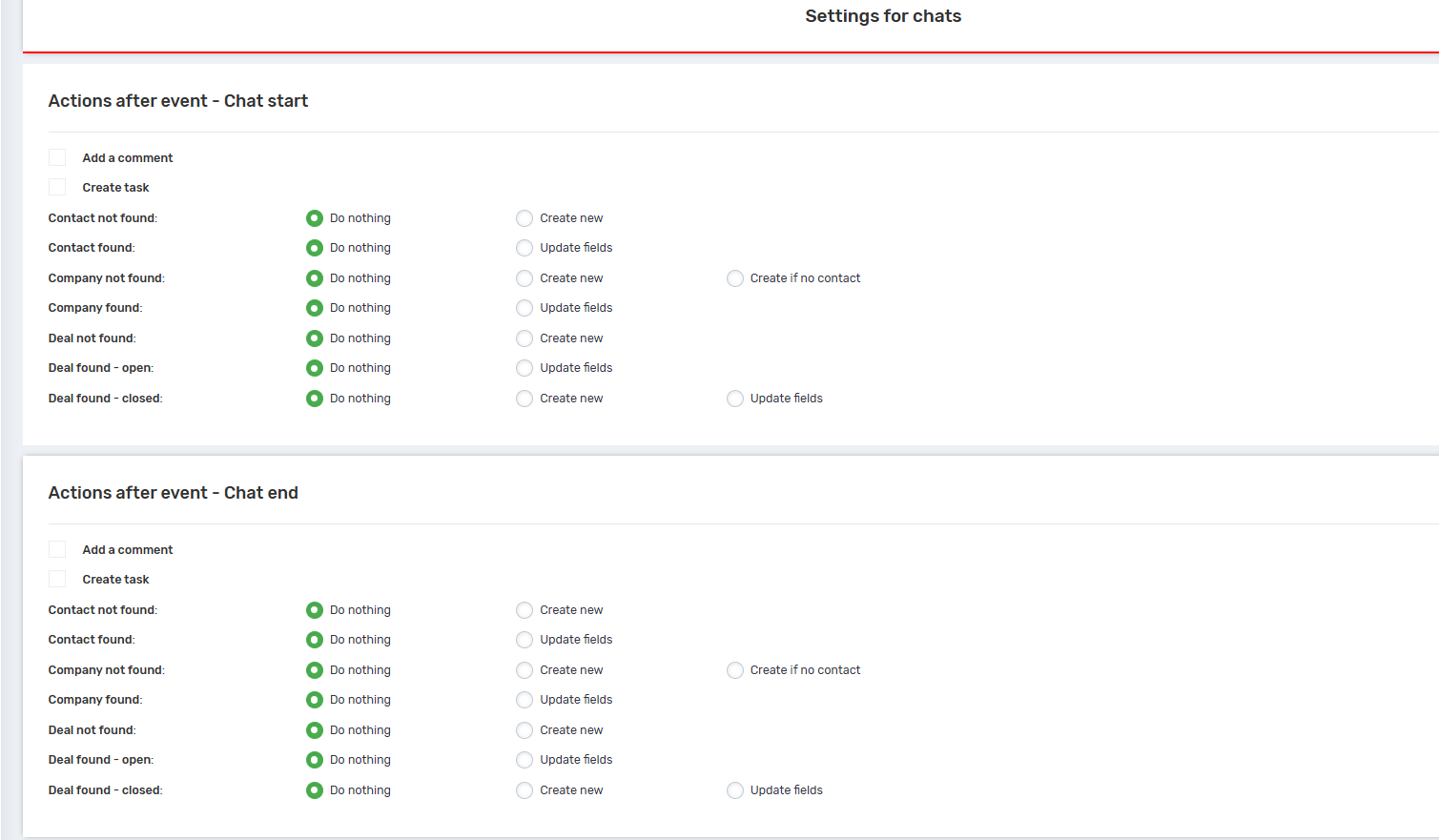 In each of these cases, you can configure whether you want to create comments, tasks, and define actions with contacts, deals, and leads.