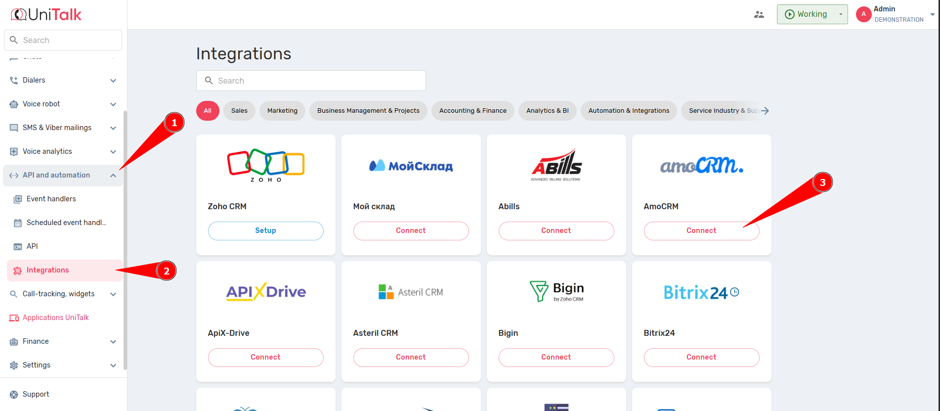 1. In the UniTalk personal account, go to the “API and automation” — “Integration” menu item, then to the “AmoCRM” menu item.