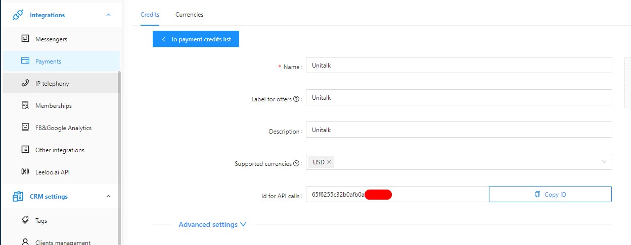 The payment system ID is specified in the Leeloo LC under “Settings/Integrations/Payments” in the “Payment Systems” tab in the card of the selected payment system in the “Id for API calls” field.