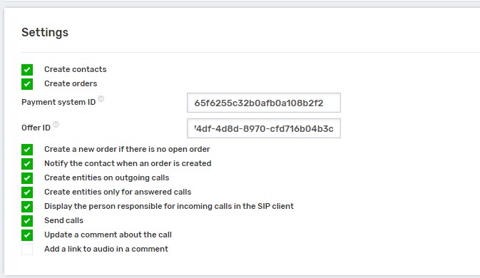 - If you enable the “Create entities only for answered calls” checkbox, contacts and orders will be created in the CRM system only for answered phone calls.