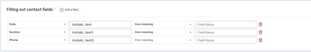 - Fill in the contact fields that will be populated with data from UniTalk when created. To fill the field you should specify the field type and its name and set the value.