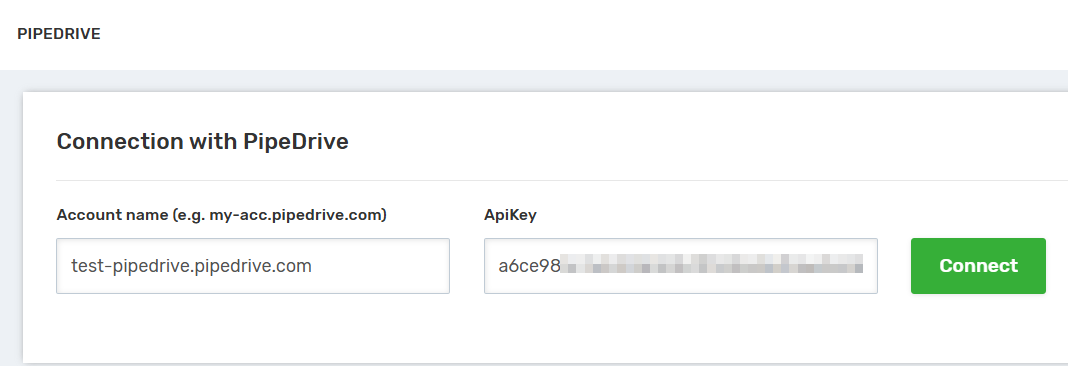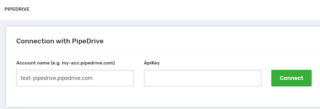 3. Go to the tab “PipeDrive” in the “Integration” section and insert the copied domain into the “Account Name” field, adding “.pipedrive.com” at the end.