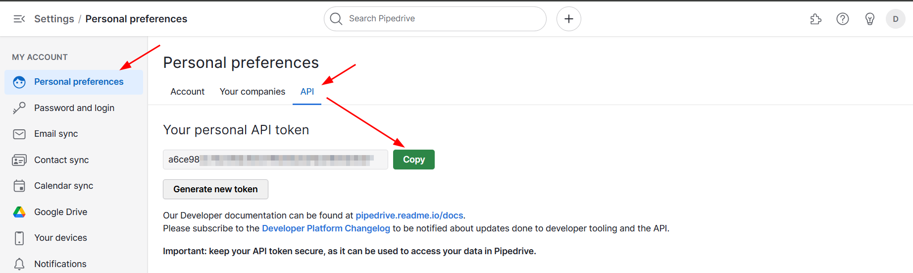 4. Next in the CRM system, go to the “Personal Settings” section, “API” tab, and copy the key.