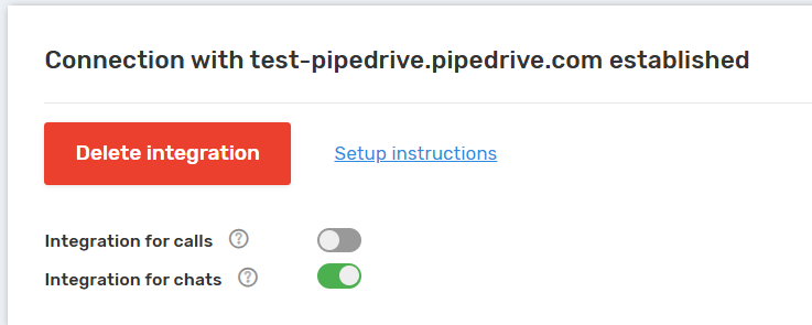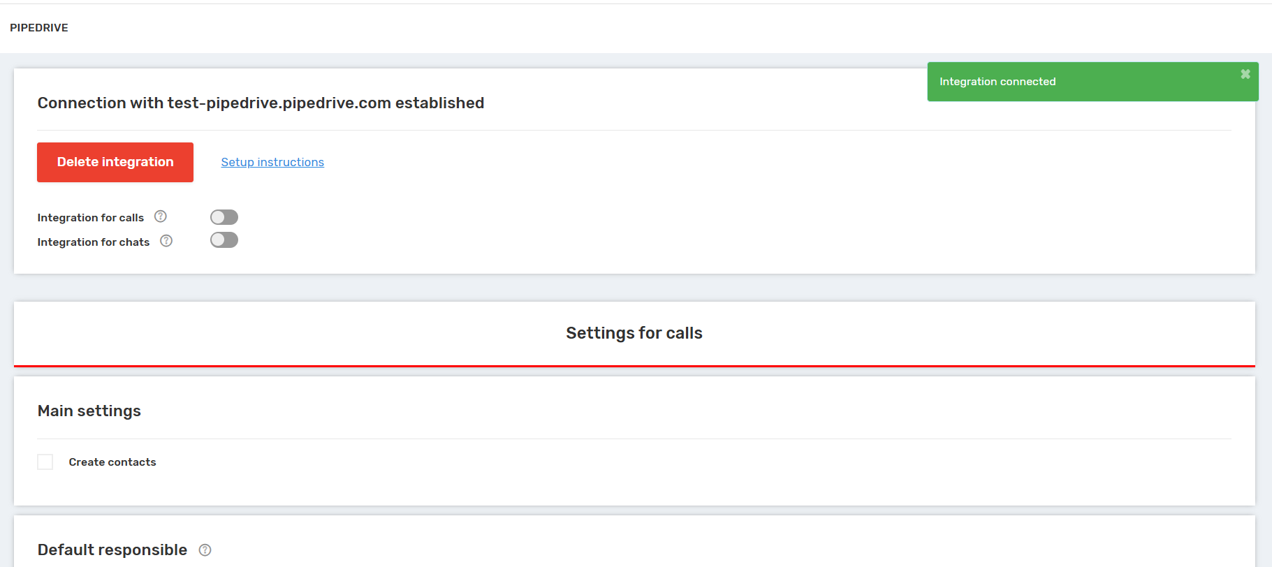 The PipeDrive integration page contains 2 blocks of settings – for calls and for chats. Each of these blocks has separate settings and its own button for saving settings*.