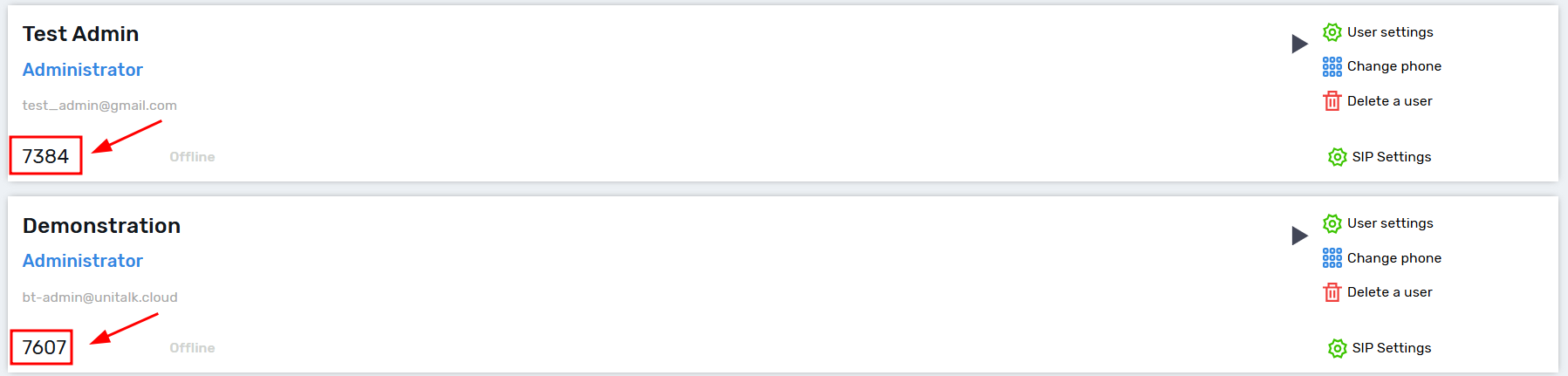 To set up automatic calls from the contact card of the CRM system – in the “Internal Numbers” section, it is necessary to specify the internal line number for each PipeDrive user. These numbers can be viewed in the section “Users” of the UniTalk personal account.