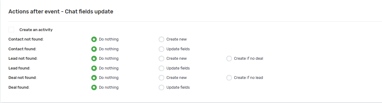In each of these cases, you can configure whether you want to create comments, tasks, and define actions with contacts, deals, and leads.