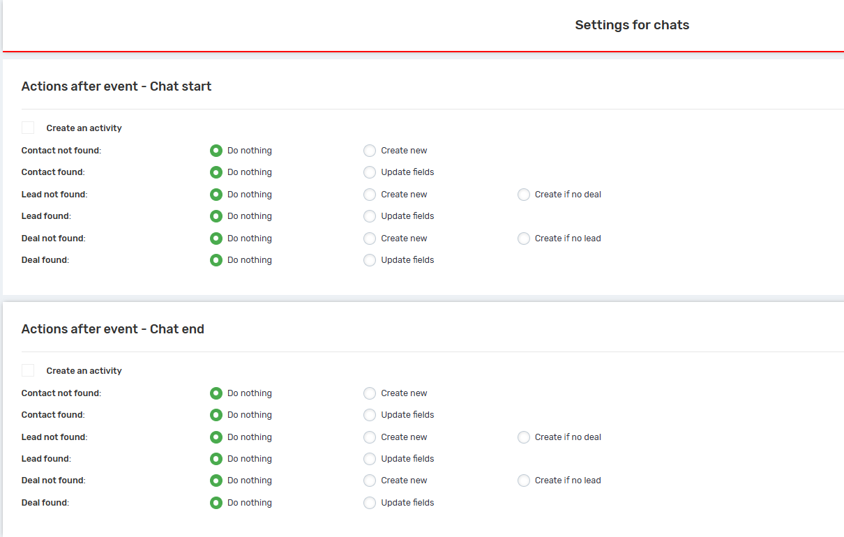 The integration can automatically create or update contacts, deals, and leads, as well as add comments on chat events and create tasks in such cases: