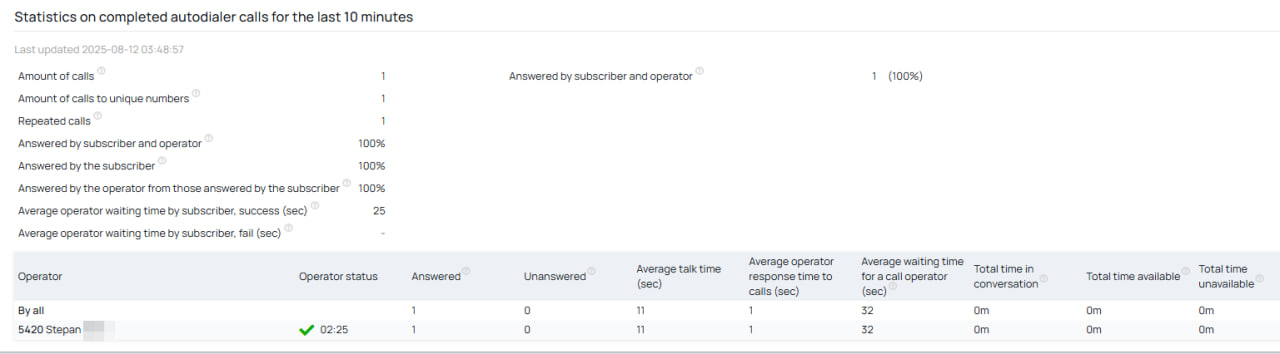 If call forwarding to an operator/operators is configured in the call, information about the statistics for this call with detailed information about the operators will be available in the “Calls” section.
