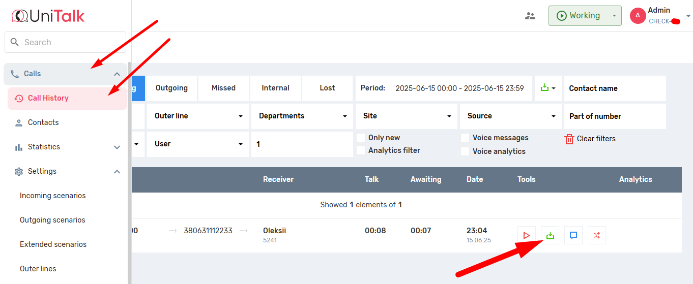 Go into the UniTalk call history and download the recording of this call to the PC.