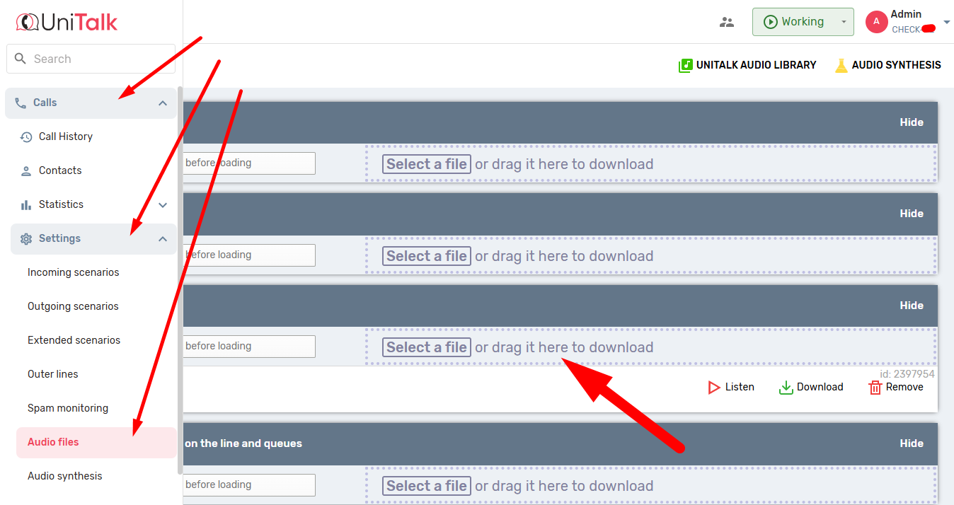 Go to the section IP-telephony – Audio files and upload the record to the auto-calling block.