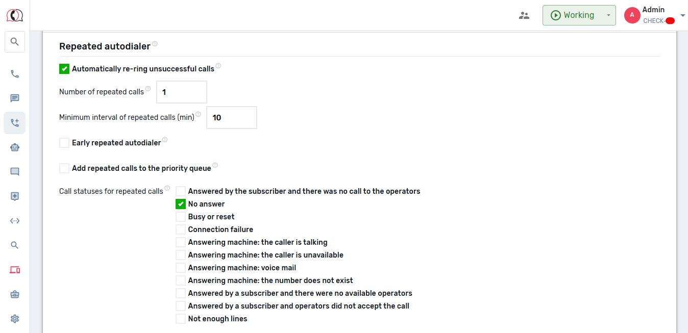 In dialing there are always unsuccessful calls, some people do not pick up the phone or for other reasons the call will not take place. All such calls can be re-dialled. You can specify number of callbacks interval between them, callbacks with or without priority and select call statuses by separating those who do not need to call back, for example, those who picked up the phone and dropped the call.