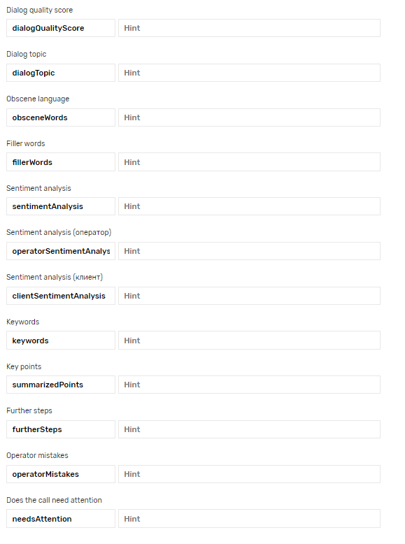 These parameters are mandatory and are the minimum data set for building call analytics. However, for a better analysis of the call you should fill in the prompts to evaluate certain categories and parameters that are important to you: assessing the level of customer satisfaction, identifying the key points of the conversation or resolving possible problems.