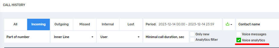 The Call History page has a separate filter for calls with speech analytics, i.e. only those for which analytics have been performed.
