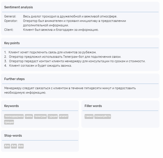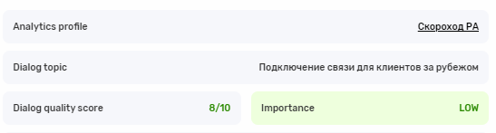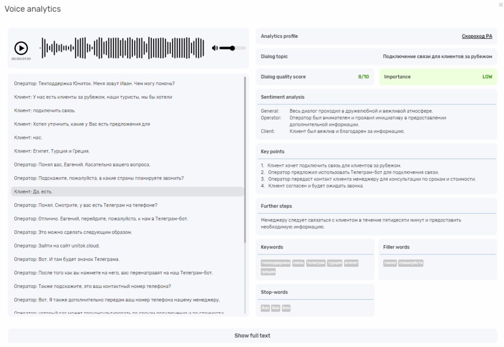 3.call analytics block – a combined block for displaying all analytics results: analytics profile, dialog topic, dialog quality assessment, importance, mood analysis, key dialog moments, operator errors, next steps, key words, parasite words, stop words, foul words, show full text.