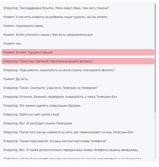 - key moments of dialog – the main phrases or statements that define the course of the conversation and allow to get semantic information in a brief form;