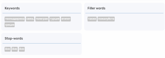 Key words, parasite words, stop words, profanity words – this is a list of words that were encountered in the conversation. When you click on a word, the audio of the moment of the dialog where it was spoken will be played. If there are several such words, then if you press on it again, the next part of the dialog with this word will be played.