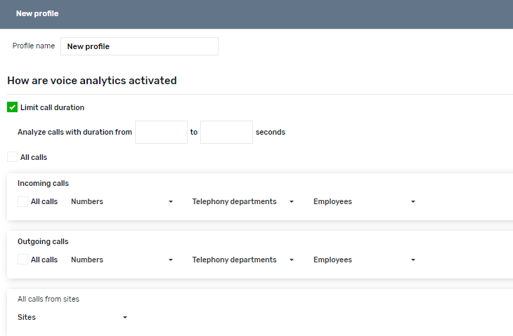 Analytics profiles can be created and customized for specific tasks (e.g., calls from different company departments). Profiles can be activated or deactivated as needed. The settings templates in them remain saved, so you can reactivate call analytics for a specific profile at any time.