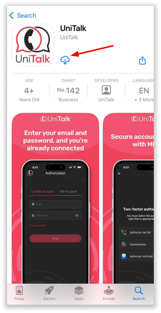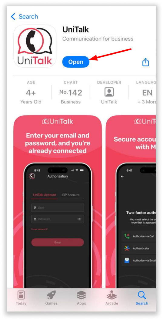 To download the UniTalk app on your smartphone, follow the link in the App Store. Click “Get”, then confirm the installation by selecting “Install”.