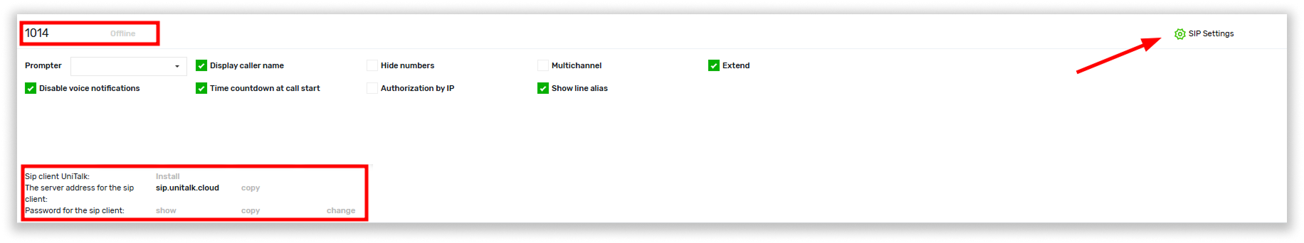 You can find this information in the UniTalk personal account of your project, under the “Users” section. Navigate to SIP Settings, and copy the credentials for the working SIP line: