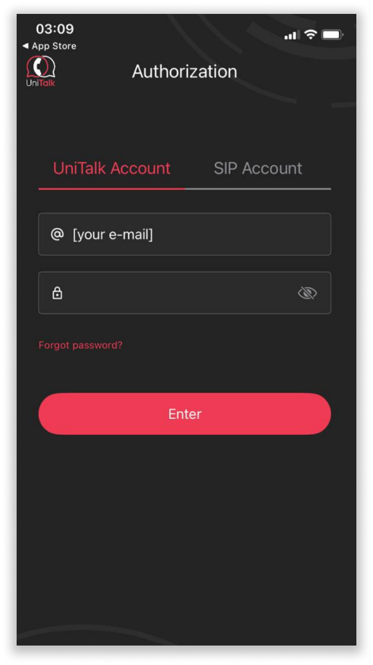 Authorization in the UniTalk Mobile App is available using the credentials from your UniTalk personal account. However, for this to work, your account must have an assigned active SIP line in the project.