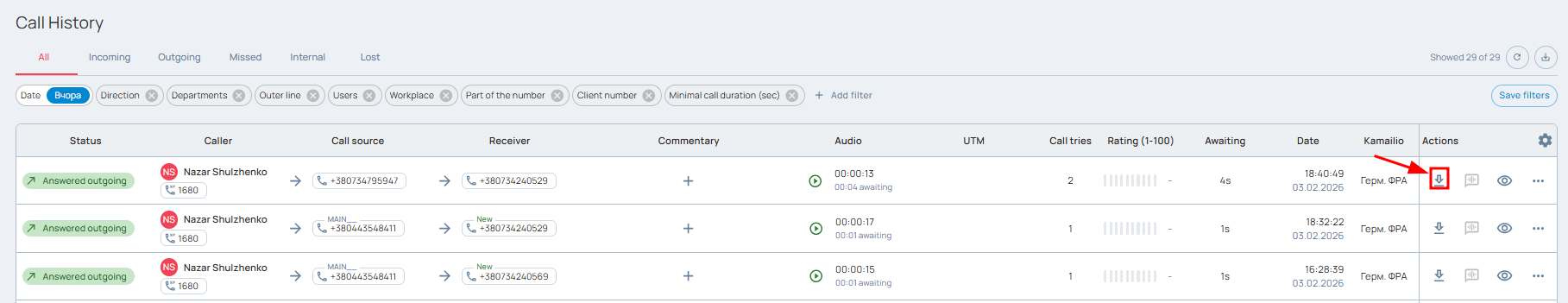 - Go into the UniTalk call history and download the recording of this call to the PC.