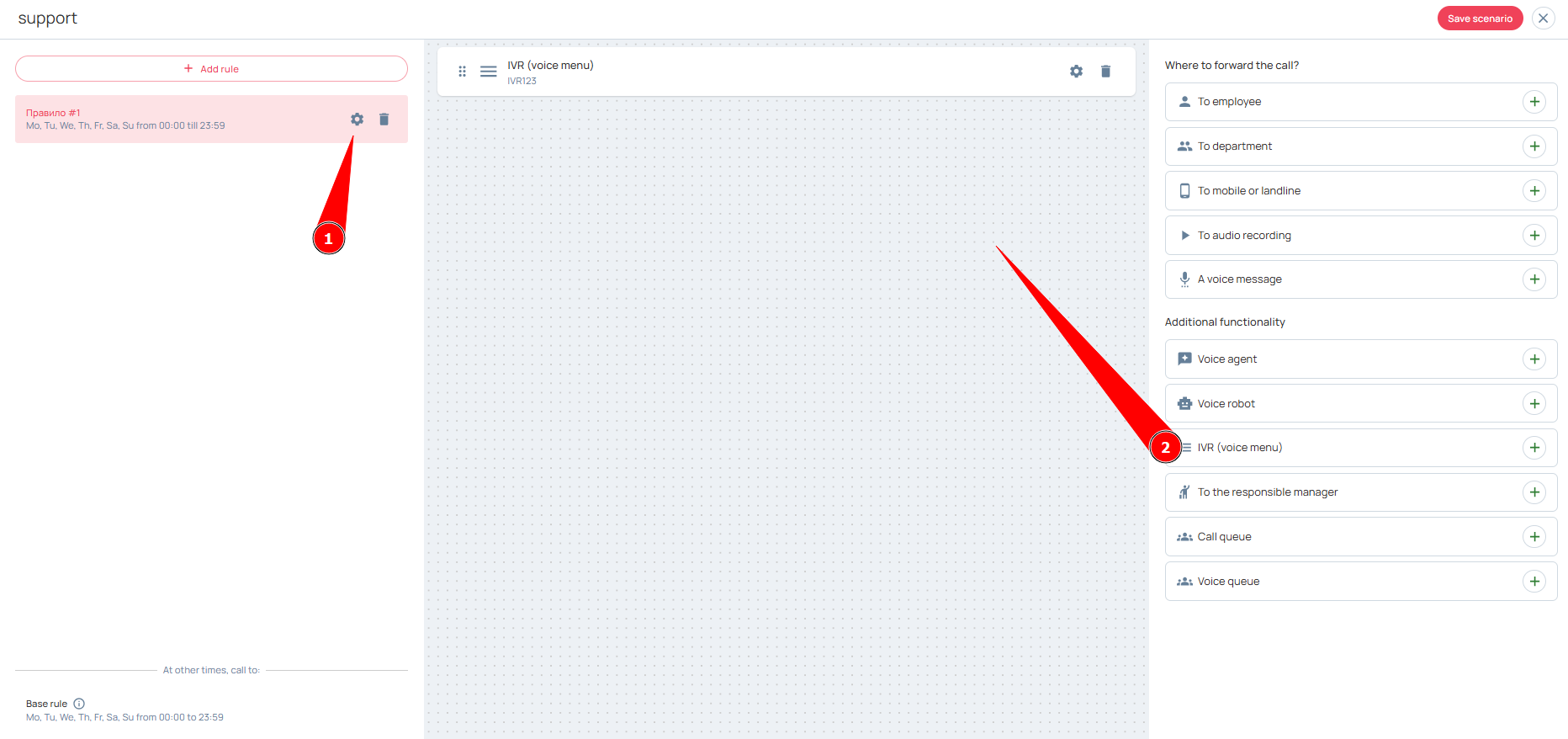 In the newly created rule, specify the name, the work schedule if it is needed and drag the “IVR (voice menu)” block with the left mouse button.